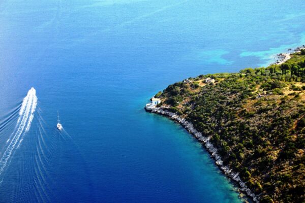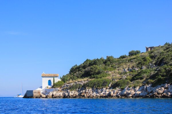 Discover the winter shelter for fishing boats, a mere 100 meters from Ithaca, with crystal-clear azure waters. Engage in snorkeling or paddling along the virgin coasts of Lygia and Ithaca using the SUP provided.